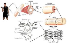 هر عضله اسکلتی از تعداد زیادی فیبر عضلانى که هریک از این فیبرها خود محتوى صدها تا هزارها میوفیبریل است تشکیل میشود و هر میوفیبریل نیز به نوبه خود داراى حدود ۱۵۰۰ فیلامان میوزین و دو برابر آن فیلامان هاى اکتین است که در کنار یکدیگر قرار دارند.